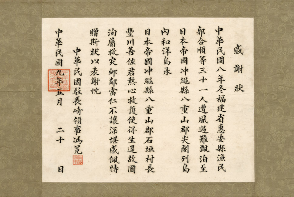 1919年年12月末、嵐に遭った中国漁船が尖閣諸島に漂着、福建省漁民が救助され、石垣島に移送された。石垣村役場が保護にあたり、長崎駐在中華民国領事と交渉の末、翌年1月21日に送還船を送り出した。のちに長崎駐在中華民国領事は石垣村長・豊川善佐らに感謝状を送った。感謝状に、遭難場所が「日本帝国沖縄県八重山郡尖閣列島」と記されていることから、日本政府系機関が「日本領有を中国側が認めていた証拠」として、ホームページなどで画像を公開、世界に向けて日本帰属の正当性を主張している。