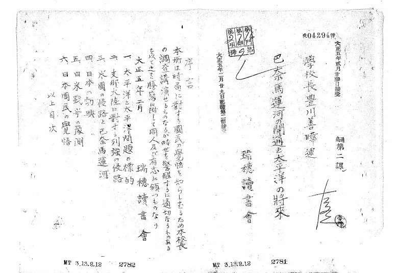 豊川善曄も早い段階から、日米衝突を予言している。パナマ運河が開通した翌年の1915年、山梨県の瑞穂小学校校長だった豊川は現地視察。帰国すぐ、時局に対する国民の啓蒙を開こうと「巴奈馬(パナマ)運河の開通と太平洋の将来」と題する講演会を開く。さらに冊子にまとめ有志らに配布、外務大臣宛にも郵送しており、その現物が国立公文書館(アジア歴史資料センター)に残されている。「白人列強が中国大陸での権益獲得を狙う中、パナマ運河の開通によって米国艦隊が容易に太平洋に進出することができ、グアムやフィリピンまで勢力を拡大。日本が朝鮮、満洲に手を伸ばしたことで米国では排日機運が燃え盛り、いずれ米国との決戦に至る、国民はその覚悟を持たなければならない」。通商への影響だけでなく、地政学・海洋戦略・国際関係・軍事バランスにまで踏み込んでいる。米国のシーパワー理論を打ち立てたマハン『海上権力史論』でもパナマ運河は重視されていた。今なお米国の世界覇権を左右する要衝であることは、トランプ大統領がパナマ運河占有に意欲を見せていることからも分かる。